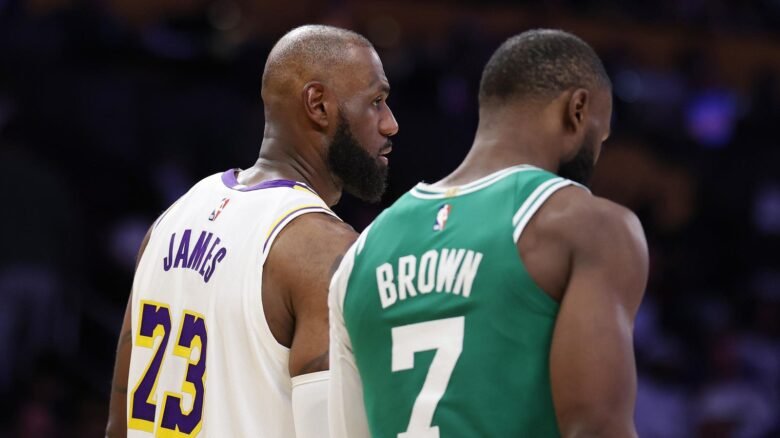 LOS ANGELES, CALIFORNIA – FEBRUARY 22: LeBron James #23 of the Los Angeles Lakers looks on during the second half of their game against the Boston Celtics at Crypto.com Arena on February 22, 2026 in Los Angeles, California. NOTE TO USER: User expressly acknowledges and agrees that, by downloading and or using this photograph, User is consenting to the terms and conditions of the Getty Images License Agreement. (Photo by Luiza Moraes/Getty Images)