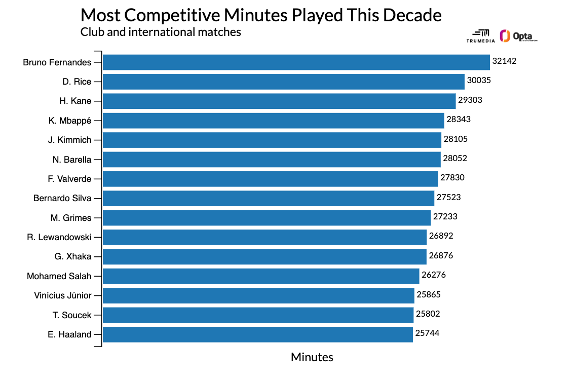 So, to review: Fernandes has played over 2,000 more competitive minutes than any other midfielder or attacker since 2020 — that’s nearly a full extra season of game time compared to second-place Declan Rice.