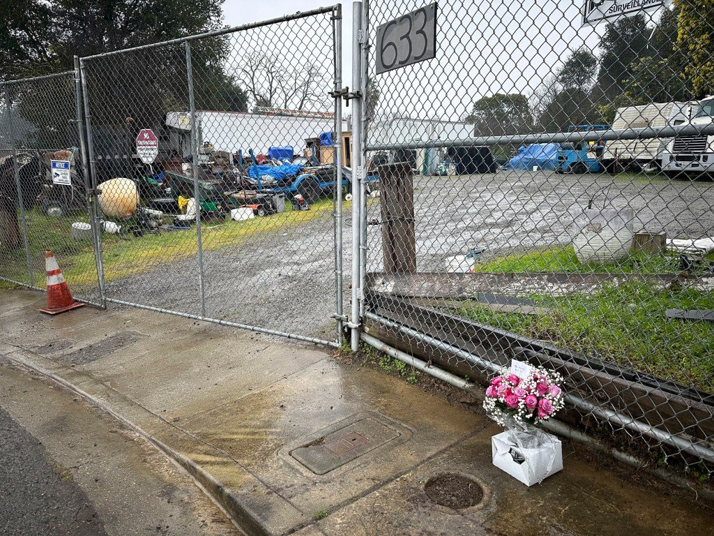 Flowers sit outside of the property where Curtis Lind was killed in Vallejo, California.