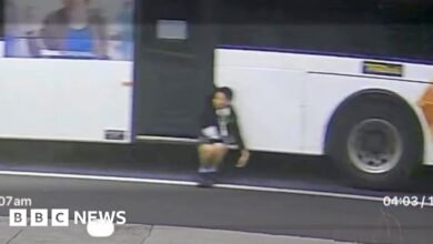 CCTV footage shows a boy dangling from the rear doors of a moving bus in Melbourne, Australia. The boy, 12,…