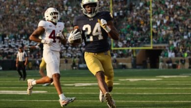 SOUTH BEND, INDIANA – OCTOBER 12: Jadarian Price #24 of the Notre Dame Fighting Irish runs for a touchdown against…