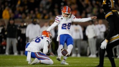 Florida place-kicker Trey Smack kicks a field goal during the first half of an NCAA college football game against Missouri.…